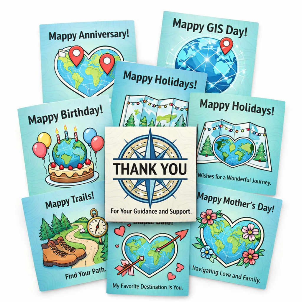 GIS Day, Mappy Holidays, Congratulations, Mappy Anniversary, Mappy Birthday, Mappy Boss's Day, Mappy Father's Day, Mappy Mother's Day, Mappy New Year, Mappy Retirement, Mappy Trails, Mappy Valentine's Day, Thank You